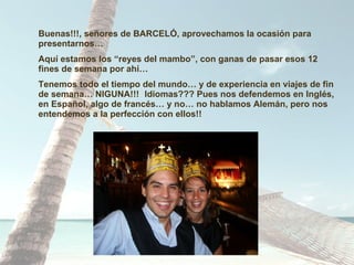 Este documento presenta la solicitud de Jesús y María para 12 viajes de fin de semana gratis a través de un programa de Barceló. Jesús estudió derecho y ahora dirige pequeños negocios, mientras que María estudió turismo y ahora se prepara oposiciones. Aunque no tienen mucha experiencia en viajes de fin de semana, se describen a sí mismos como personas adaptables que disfrutan de la buena vida. Esperan que esta oportunidad les permita viajar en primera clase y alojarse en suites de lujo, aunque reconocen que todo sería