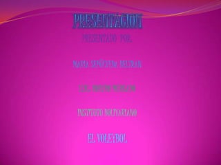 El documento resume la historia y las reglas básicas del voleibol. Se originó en 1895 en Estados Unidos y la Federación Internacional de Voleibol se fundó en 1947. Se juega entre dos equipos divididos por una red, con el objetivo de pasar el balón al campo contrario sin cometer faltas como exceder el número de toques o pasar el balón fuera de los límites. Se anota punto cada vez que el equipo contrario comete una falta o el balón toca el suelo de su campo.
