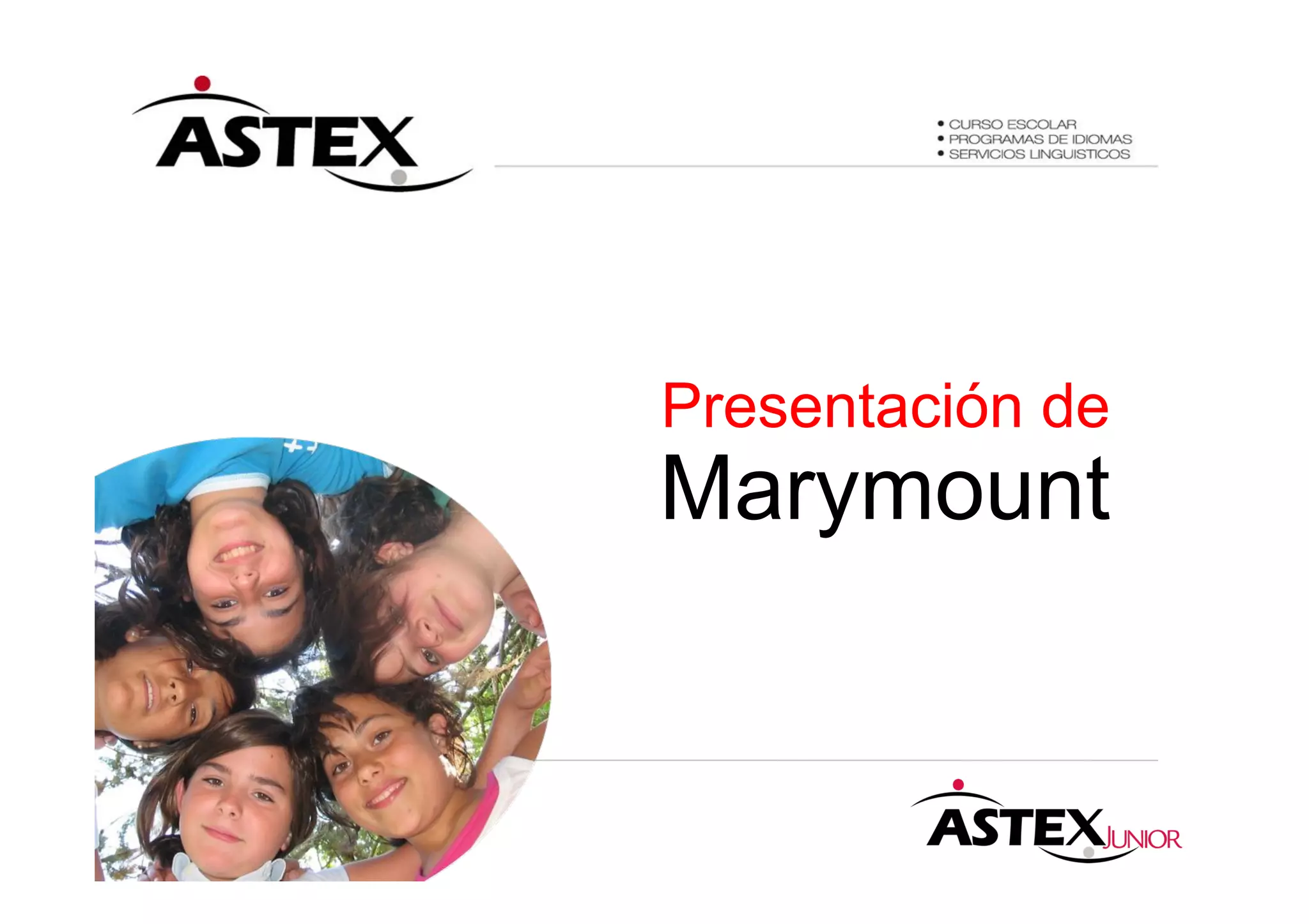 Este documento presenta el centro Marymount, un internado mixto para estudiantes de 8 a 12 años ubicado a 15 km de Londres. El campus ofrece instalaciones como campos deportivos, piscina cubierta, pistas de tenis y teatro. El curso de inglés intensivo incluye 26 clases semanales combinadas con talleres. Las actividades extracurriculares incluyen deportes, manualidades y excursiones semanales a Londres y alrededores. Los estudiantes se alojan en habitaciones individuales o compartidas separadas por sexo.