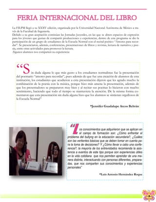 Este documento presenta información sobre la Feria Internacional del Libro (FIL) realizada en la Universidad Nacional Autónoma de México (UNAM). Incluye resúmenes de presentaciones y conferencias, como el recital poético "Amores para recordar" de estudiantes de la Escuela Normal y una conferencia sobre los roles de género. También describe la participación de estudiantes y profesores de la Escuela Normal de Sultepec en el Congreso Internacional y 6° Congreso Nacional sobre políticas educativas.