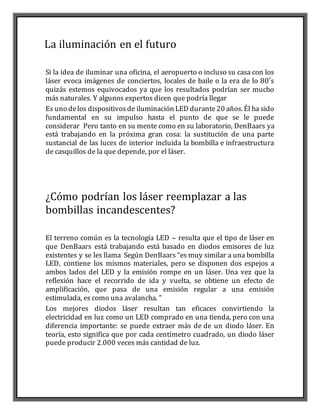 El documento habla sobre el potencial de los láseres para reemplazar las bombillas incandescentes y LED en el futuro de la iluminación. Los láseres basados en diodos podrían producir 2000 veces más luz que los LED desde un área más pequeña, haciéndolos más eficientes. Sin embargo, simplemente reemplazar los LED en una bombilla con láseres no funcionaría debido al exceso de calor y luz generada. Los expertos continúan trabajando para desarrollar formas de aplicar esta tecnología láser de manera más