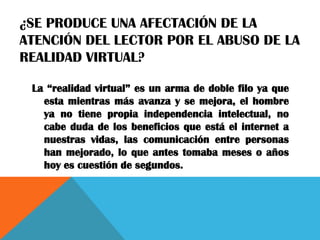 El documento discute si el abuso de la realidad virtual afecta la atención del lector. Señala que a medida que avanza la realidad virtual, el hombre pierde independencia intelectual. También indica que el interés por leer ha disminuido ya que Internet resume grandes libros y estudiantes universitarios usan esta información, lo que lleva a una formación deficiente y baja eficiencia entre los egresados debido a la escasa comprensión lectora.