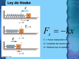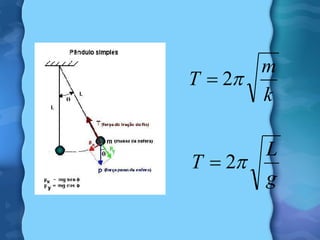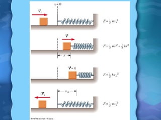 Este documento describe el movimiento armónico simple (MAS), que es un movimiento periódico producido por una fuerza de restauración proporcional al desplazamiento. Define las variables clave como la amplitud, el periodo y la frecuencia. Explica que la fuerza de restauración cambia a lo largo de la trayectoria, a diferencia de una fuerza constante, y cómo calcular la posición, velocidad y aceleración en el MAS. También compara el MAS con el movimiento circular uniforme y menciona que los péndulos exhiben movimiento