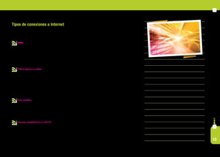 Este documento explica qué es Internet y cómo funciona. Describe que Internet es una red de computadoras conectadas que intercambian información, y brinda una breve historia de su creación y evolución desde la década de 1960 hasta la actualidad, cuando supera los 1,100 millones de usuarios. También define los principales tipos de conexión a Internet, como ADSL, fibra óptica y satelital, y explica conceptos clave como navegadores, sitios web, direcciones URL y dominios.
