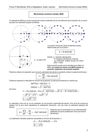 El documento describe el movimiento armónico simple (MAS), que es el movimiento oscilatorio más sencillo. Un cuerpo se mueve con MAS cuando su posición (x) sigue la ecuación x = A sen(ωt + φ), donde A es la amplitud, ω la velocidad angular y φ la fase. La velocidad y aceleración también siguen funciones seno y coseno del tiempo. El MAS se repite cada periodo T=2π/ω.