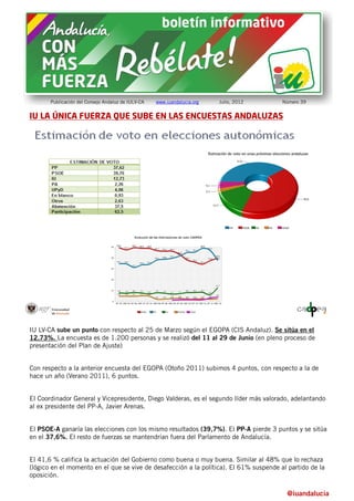 IU es la única fuerza política que aumenta en las encuestas andaluzas según el EGOPA (CIS Andaluz), situándose en el 12,73%, 1 punto más que en marzo. La encuesta se realizó entre el 11 y 29 de junio, durante la presentación del Plan de Ajuste. Respecto a la encuesta anterior de otoño de 2011, IU sube 4 puntos, y respecto a la de verano de 2011, 6 puntos. El coordinador general de IU, Diego Valderas, es el segundo líder político más valorado, por delante del ex presidente del