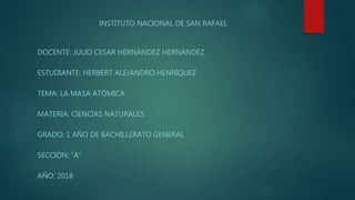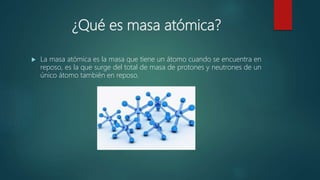La masa atómica representa la masa total de protones y neutrones que componen un átomo individual. John Dalton fue el primer científico en estudiar y calcular el peso atómico de los elementos y desarrolló una teoría fundamental sobre la composición atómica de la materia. La masa atómica se mide en unidades de masa atómica y se representa en la tabla periódica por la letra A, indicando la suma de protones y neutrones en el núcleo de cada elemento.