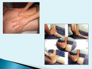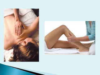 Este documento describe diferentes técnicas de masaje como el efluragge, fricción y pretissage. Explica los objetivos mecánicos, fisiológicos, preventivos, terapéuticos, estéticos e higiénicos del masaje. También cubre contraindicaciones como embarazo, cirugía reciente, enfermedades infecciosas o tumorales.