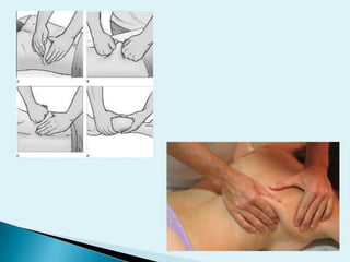 Este documento describe diferentes técnicas de masaje como el efluragge, fricción y pretissage. Explica los objetivos mecánicos, fisiológicos, preventivos, terapéuticos, estéticos e higiénicos del masaje. También cubre contraindicaciones como embarazo, cirugía reciente, enfermedades infecciosas o tumorales.