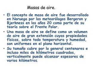 Este documento describe las masas de aire, incluyendo su origen, propiedades y clasificación. Las masas de aire se forman sobre grandes áreas oceánicas o continentales donde el clima es homogéneo y luego se desplazan conservando sus características de temperatura y humedad. Se clasifican según su región de origen (ártica, polar, tropical) y contenido de humedad (continental, marítima). Cuando dos masas de aire con propiedades diferentes se encuentran, se forma un frente que separa los cambios abruptos en las