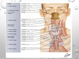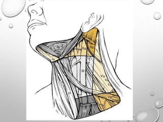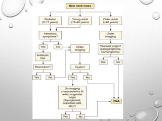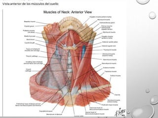 Este documento proporciona una descripción general de la anatomía del cuello, incluyendo los huesos, fascias, compartimentos y triángulos del cuello. También describe la embriología del cuello y la cabeza, y los tumores cervicales congénitos, inflamatorios y neoplásicos que pueden presentarse en el cuello. Explica el protocolo para el estudio de masas cervicales, incluyendo el examen físico, pruebas de laboratorio e imágenes.