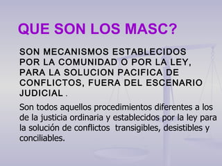 Los métodos alternativos de solución de conflictos en Bolivia incluyen la negociación, conciliación, mediación y arbitraje. La constitución y la ley reconocen estos métodos y fomentan su uso para resolver disputas de manera pacífica fuera de los tribunales. La ley establece procedimientos de conciliación facilitados por terceros imparciales para resolver controversias de manera consensuada antes o durante un proceso judicial.