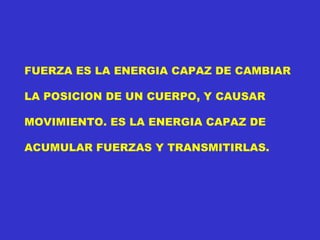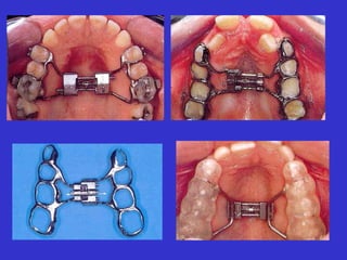 El documento habla sobre las fuerzas en ortodoncia y ortopedia dentofacial. Explica que existen fuerzas naturales y terapéuticas, y describe las fuerzas ortopédicas fuertes que se aplican a través de máscaras como la de Delaire-Verdon para mover los huesos a través de las suturas y mejorar el desarrollo maxilar. También señala que es importante aplicar estas fuerzas de manera interrumpida para provocar un efecto sobre las suturas y lograr los cambios deseados en la e