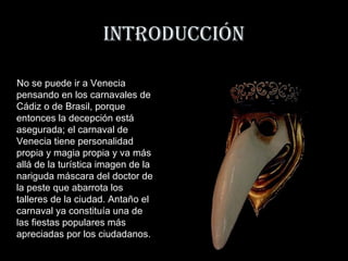 El carnaval de Venecia tiene una personalidad y magia propias que van más allá de las imágenes turísticas de máscaras. Antiguamente, el carnaval ya era una de las fiestas populares más apreciadas por los ciudadanos venecianos. Durante el carnaval, que duraba seis meses en la época de esplendor de Venecia, las máscaras permitían ocultar las identidades y dar rienda suelta a los instintos. Algunos disfraces tradicionales incluían personajes de la comedia del arte y el terror