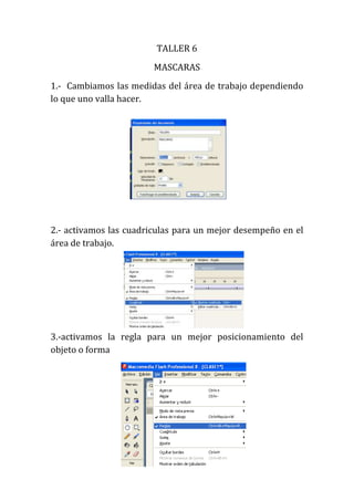 Este documento proporciona instrucciones para crear una máscara en Adobe Illustrator. Explica cómo cambiar las medidas del área de trabajo, activar cuadrículas y reglas, separar un texto en varias capas de color, crear una lupa en otra capa y convertirla en símbolo, animar el tamaño de la lupa a través de fotogramas, aplicar una máscara a la capa de la lupa, y probar la película.