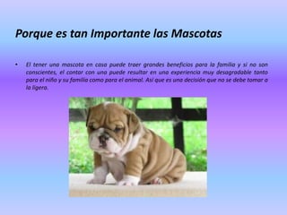 Las mascotas pueden traer grandes beneficios para las familias como mayor comunicación y convivencia, pero también son una gran responsabilidad que requiere cuidado, alimentación y mantenerlas sanas. Es importante considerar un seguro para las mascotas para cubrir gastos médicos. Adoptar una mascota en lugar de comprarla le da una oportunidad de cambiar tu vida a un animal necesitado.