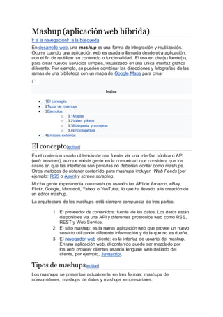 Este documento describe los mashups, que son aplicaciones web híbridas creadas al combinar contenido u funcionalidad de múltiples fuentes a través de APIs. Los mashups permiten la reutilización y la integración de datos para crear nuevos servicios visualizados en una interfaz unificada. Algunos ejemplos comunes incluyen combinar mapas, fotos, videos y datos de búsqueda de diferentes sitios.