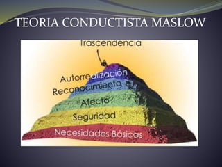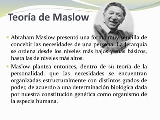 La teoría de la jerarquía de las necesidades de Maslow propone que las necesidades humanas se organizan en una pirámide de cinco niveles, desde las fisiológicas en la base hasta la autorrealización en la cima. Según Maslow, una vez satisfechas las necesidades de un nivel, el individuo se enfoca en las del nivel superior; sin embargo, es difícil alcanzar la cima debido a las dificultades para satisfacer completamente las necesidades básicas.