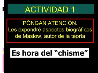 Abraham Maslow propuso una jerarquía piramidal de necesidades humanas compuesta por 5 niveles. En el nivel más bajo se encuentran las necesidades fisiológicas como el hambre y la sed. Luego están las necesidades de seguridad, pertenencia social y reconocimiento. En la cima se ubican las necesidades de autorrealización, relacionadas con alcanzar nuestro máximo potencial. Maslow observó que a medida que se satisfacen las necesidades de un nivel, las personas se enfocan en las del siguiente nivel superior.
