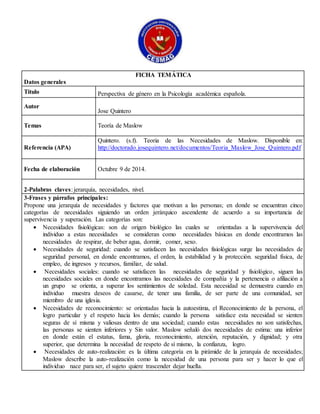Este documento presenta un resumen de la teoría de las necesidades humanas propuesta por Maslow. Maslow propuso una jerarquía piramidal de necesidades, colocando en la base las necesidades fisiológicas y de seguridad, seguidas por las necesidades sociales y de reconocimiento, con la auto-realización en la cima. Explica que las personas buscan satisfacer primero sus necesidades más básicas antes de pasar a necesidades más elevadas, y que al satisfacer una necesidad surgen otras para ser satisfechas.