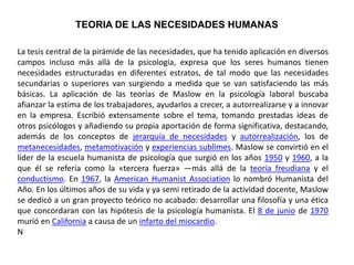 Abraham Maslow postuló que las necesidades humanas se organizan en una jerarquía que va desde necesidades básicas hasta la autorrealización, y definió su enfoque como 'psicología humanista'. Su trabajo, influenciado por otras teorías psicológicas, se centró en el potencial humano y las experiencias sublimes que surgen al alcanzar niveles superiores de necesidades. Maslow fue reconocido por su contribución a la psicología, y su legado se manifiesta en conceptos como metamotivación y experiencias cumbre.