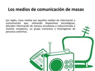 Este documento discute los medios de comunicación masiva y su impacto en la educación. Resalta tanto aspectos positivos como negativos de los medios. Argumenta que la escuela ha perdido influencia cultural a favor de los medios y las nuevas tecnologías, y que es necesario educar a los estudiantes sobre los medios para que puedan analizarlos de manera crítica.
