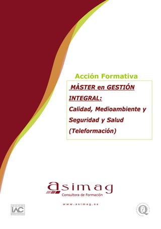 Este documento describe un máster en gestión integral que capacita a profesionales para implantar sistemas integrados de calidad, medio ambiente y seguridad y salud laboral basados en procesos. El programa dura 540 horas y cubre temas como gestión de organizaciones, sistemas de calidad, medioambientales y de seguridad, así como la integración de estos sistemas. El objetivo es que los estudiantes puedan implantar con éxito un sistema de gestión integral basado en procesos en una organización.