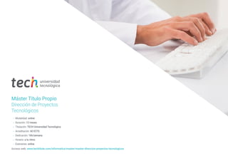 El máster en dirección de proyectos tecnológicos de la Tech Universidad Tecnológica es un programa online de 12 meses que ofrece 60 ECTS, diseñando habilidades en gestión de proyectos para el sector tecnológico. Los estudiantes aprenderán a gestionar desde el diseño hasta la evaluación de riesgos y presupuestos en proyectos complejos, preparándolos para roles directivos. Este curso incluye módulos prácticos con expertos y acceso a contenido multimedia, lo que lo convierte en una opción atractiva para desarrollar competencias esenciales en un mercado laboral en crecimiento.