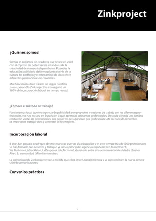 Zinkproject es un colectivo de creadores fundado en 2003 con el objetivo de potenciar la creatividad de manera independiente y promover la educación publicitaria a través del intercambio de ideas entre generaciones. Funciona como una agencia de publicidad, con proyectos y sesiones de trabajo con profesionales. Más de 1000 alumnos se han formado allí y trabajan ahora en importantes agencias españolas e internacionales. El documento proporciona detalles sobre su método de trabajo, tasas de incorporación laboral y convenios de práctic