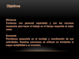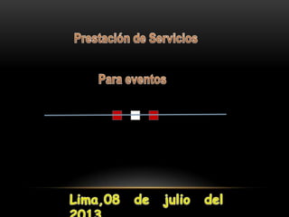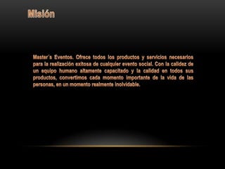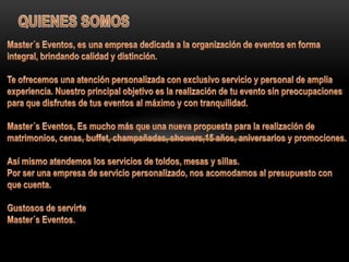 Master Eventos ofrece servicios para eventos como matrimonios, quinceañeras y buffets ubicado en la Av. Manuel Fernandez No215 en Lima. Brindan servicios de catering y organización de eventos a través de sus números telefónicos y correo electrónico para cotizaciones y detalles.