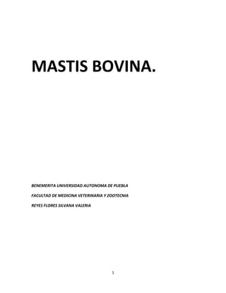 La mastitis bovina es una enfermedad infecciosa que afecta la ubre de las vacas y reduce la producción y calidad de la leche. Es causada principalmente por cuatro patógenos: Staphylococcus aureus, Streptococcus agalactiae, Streptococcus dysgalactiae y Streptococcus uberis. Su prevención y control requiere buenas prácticas de ordeño, higiene y tratamiento, mientras que su impacto económico incluye pérdidas en la producción lechera.