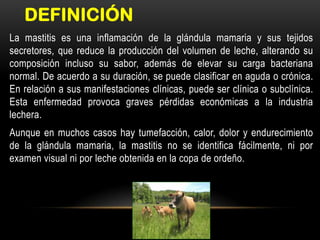 Este documento define la mastitis como una inflamación de la glándula mamaria que reduce la producción y calidad de la leche. Describe que la causa principal es una infección, mencionando bacterias como Streptococcus agalactiae y Staphylococcus aureus. Explica que la infección ocurre a través del conducto glandular y puede causar desde una inflamación leve hasta gangrena. Finalmente, recomienda tratamientos antibióticos intramamarios dependiendo del agente causal.