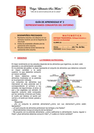 La pirámide nutricional divide los alimentos en seis conjuntos principales según su importancia para una dieta saludable. La base de la pirámide representa los alimentos que debemos consumir en mayor cantidad, como cereales y vegetales. El conjunto superior incluye alimentos como dulces y grasas, que debemos comer en menor cantidad. La pirámide guía una alimentación balanceada según la proporción recomendada de cada conjunto de alimentos.