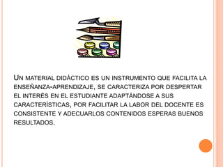 El documento describe diferentes tipos de materiales didácticos que se pueden utilizar en el aula para facilitar la enseñanza y el aprendizaje. Explica que los materiales didácticos son instrumentos que atraen el interés del estudiante y apoyan tanto al docente como al contenido educativo. Además, clasifica los materiales didácticos en impresos, gráficos, mixtos y auditivos e incluye ejemplos como libros, revistas, periódicos, proyectores, carteles y videos.