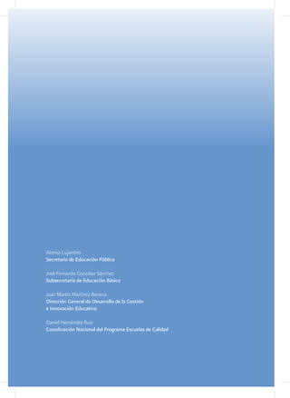 Esta guía presenta información sobre la inclusión educativa de alumnos con discapacidad en escuelas del Programa Escuelas de Calidad (PEC). En primer lugar, aclara conceptos como integración educativa y necesidades educativas especiales. Luego, describe condiciones que deben estar presentes en las escuelas para promover la inclusión, como informar, sensibilizar y trabajar con familias. Finalmente, presenta datos sobre el número de escuelas PEC que atienden a estudiantes con discapacidad. El objetivo es brindar herramientas para