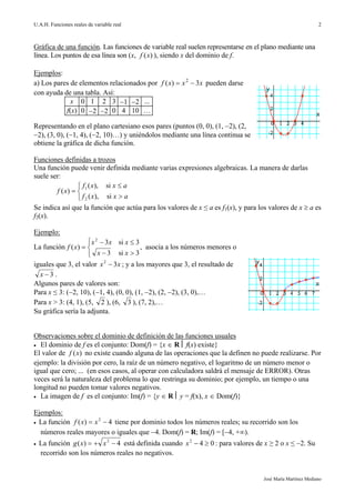 Este documento describe conceptos básicos sobre funciones reales de variable real. Define una función como una relación que asigna a cada elemento de un conjunto A un único elemento de un conjunto B. Explica que el dominio de una función es el conjunto de valores de entrada, mientras que la imagen es el conjunto de valores de salida. Proporciona ejemplos de funciones dadas por expresiones algebraicas y graficadas, y describe operaciones como suma, producto y composición de funciones.