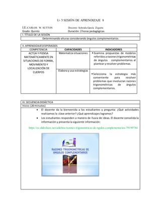 La sesión de aprendizaje trata sobre determinar alturas considerando ángulos complementarios. Los estudiantes aprenderán a utilizar las razones trigonométricas de ángulos complementarios para resolver problemas que involucren alturas y ángulos. El problema propuesto involucra hallar la altura de una construcción observada desde una caseta usando los ángulos de elevación y depresión formados, los cuales son complementarios.