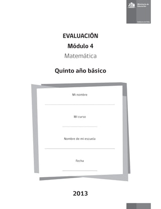 Este documento contiene la evaluación de matemáticas para estudiantes de quinto año básico. Consiste en 15 ítems con preguntas sobre estadística, probabilidad y otros temas matemáticos. Los estudiantes deben marcar la letra de la alternativa correcta para cada pregunta. El examen incluye tablas, gráficos y otros datos para analizar y responder las preguntas planteadas.