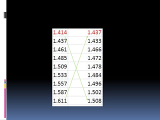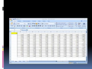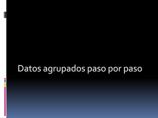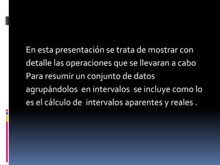 Este documento describe los pasos para agrupar un conjunto de datos en intervalos. Estos incluyen calcular el rango de los datos, determinar el tamaño de intervalo dividiendo el rango entre el número de intervalos, y calcular los límites inferiores y superiores de cada intervalo sumando el tamaño de intervalo de forma secuencial. Se debe revisar que los primeros y últimos límites cumplan con ciertas condiciones para que los intervalos sean válidos. Es posible que se necesiten ajustar valores como el número de intervalos o el tamaño