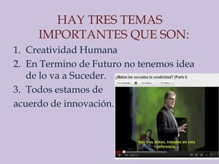 El documento discute cómo los sistemas educativos actuales pueden sofocar la creatividad. Señala que los niños son más libres de equivocarse, mientras que los sistemas educativos se centran demasiado en las calificaciones académicas y jerarquías de ideas útiles. También destaca que la inteligencia es diversa y dinámica, por lo que los sistemas educativos deben permitir más imprevisibilidad e innovación para desarrollar plenamente la creatividad humana.
