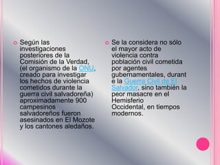 En diciembre de 1981, unidades del ejército salvadoreño llegaron al cantón de El Mozote buscando insurgentes y masacraron a aproximadamente 900 campesinos salvadoreños, incluyendo hombres, mujeres y niños. Se considera la peor masacre en el Hemisferio Occidental en tiempos modernos. Los soldados torturaron y ejecutaron de forma sistemática a los residentes en distintos lugares del pueblo durante dos días, separando primero a los hombres y luego a las mujeres y niños. Sólo sobrevivió una mujer