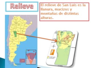 La provincia de San Luis se divide en tres regiones con climas diferentes: la sierra de San Luis y el valle de Conlara tienen un clima templado; la depresión de las Salinas del Bebedero tiene amplitud térmica más pronunciada y poca precipitación; y las zonas de planicie tienen un clima de transición entre el semihúmedo pampeano y el árido del oeste. Algunas de las especies nativas incluyen algarrobos, caldén, tala, molle y chañares.