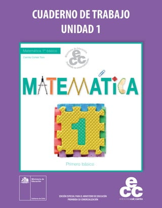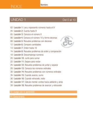 Este documento presenta información sobre la unidad 1 de matemáticas de primer básico. Incluye 18 lecciones que abordan temas como números hasta el 10, sumas y restas sencillas, comparación de cantidades, resolución de problemas matemáticos y uso de material concreto para representar conceptos numéricos. El documento contiene ejercicios, actividades y soluciones para cada lección.