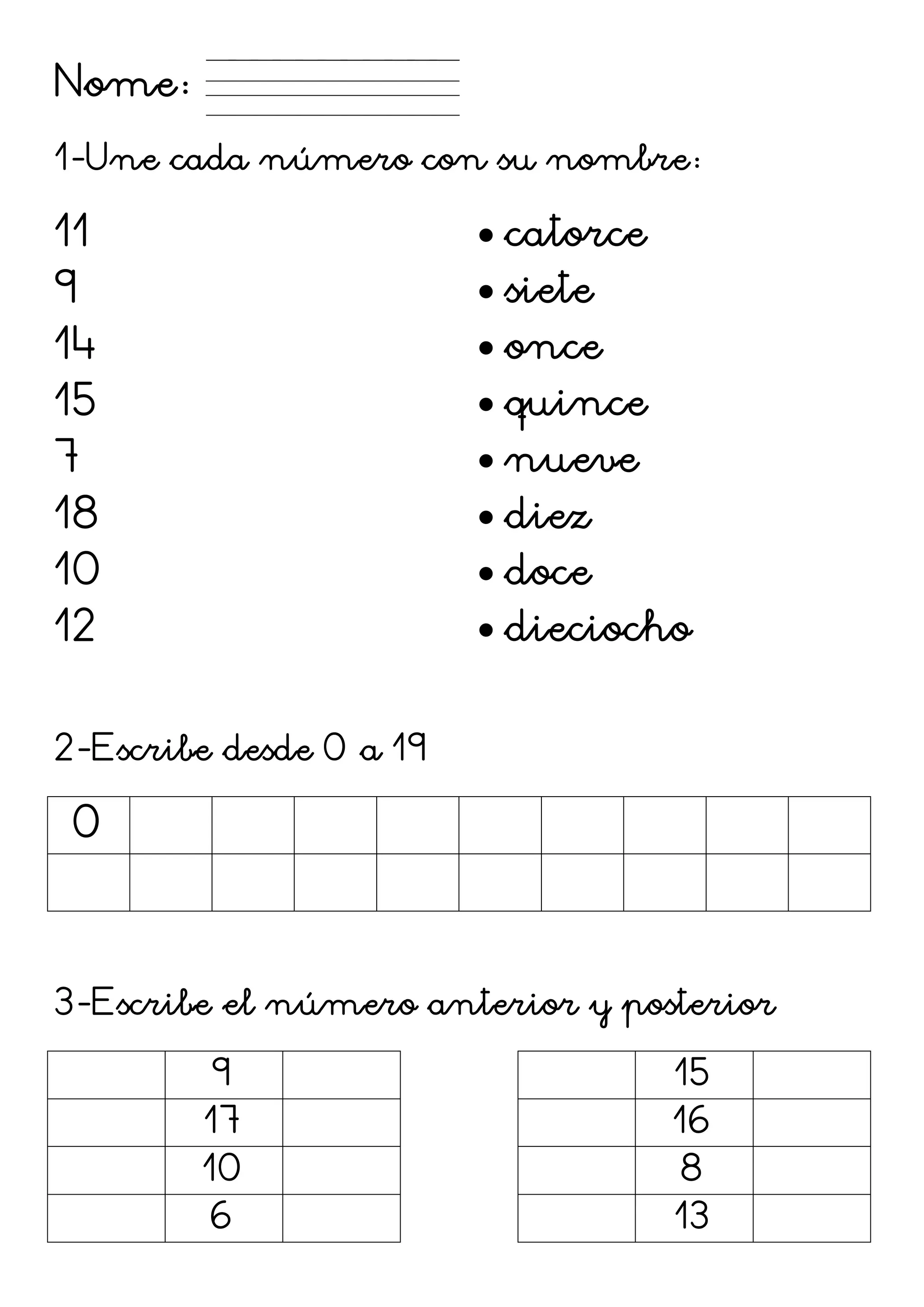 El documento presenta una lista de números del 0 al 19 en español y ejercicios aritméticos con números de 1 a 15. La lista incluye emparejar números del 1 al 15 con sus nombres en español y escribir la secuencia numérica del 0 al 19. Los ejercicios consisten en suma, resta, números anteriores y posteriores.
