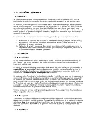 Este documento introduce los conceptos básicos de las operaciones financieras, incluyendo la definición de capital financiero, interés y leyes financieras. Explica que una operación financiera implica la sustitución de capitales a través del tiempo mediante el pago de intereses, y que para que sea válida los capitales deben ser equivalentes según la ley financiera aplicada. También describe los elementos personales, temporales y objetivos de una operación financiera, así como las distintas clases según su duración, ley financiera y número de capitales involuc