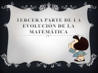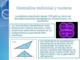 El documento lista las ciudades y años en que se llevaron a cabo las 10 primeras Conferencias Internacionales sobre Educación Matemática (ICME), desde 1969 hasta 2004. También enumera 4 objetivos clave de estas conferencias: evaluar el éxito de los programas de matemática, desarrollar un currículo flexible, profesionalizar a los maestros de matemática, y obtener apoyo público para la enseñanza de la matemática.