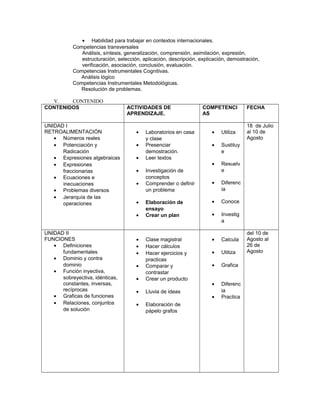 Este documento presenta la información de un curso de matemáticas para estudiantes de pedagogía en la Universidad de San Carlos de Guatemala. Incluye detalles sobre el plan de estudios, objetivos, competencias, contenidos, metodología, evaluación y bibliografía del curso. Los contenidos se dividen en cinco unidades que cubren temas como números reales, funciones, polinomios, funciones logarítmicas y exponenciales, y sistemas de ecuaciones. La evaluación consta de cuatro exámenes parciales, un exam