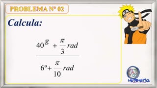 Este documento presenta tres problemas matemáticos que involucran raíces, ángulos en radianes y reducción de fracciones. Se pide hallar raíces, calcular sumas y restas de raíces y ángulos, y reducir una fracción.