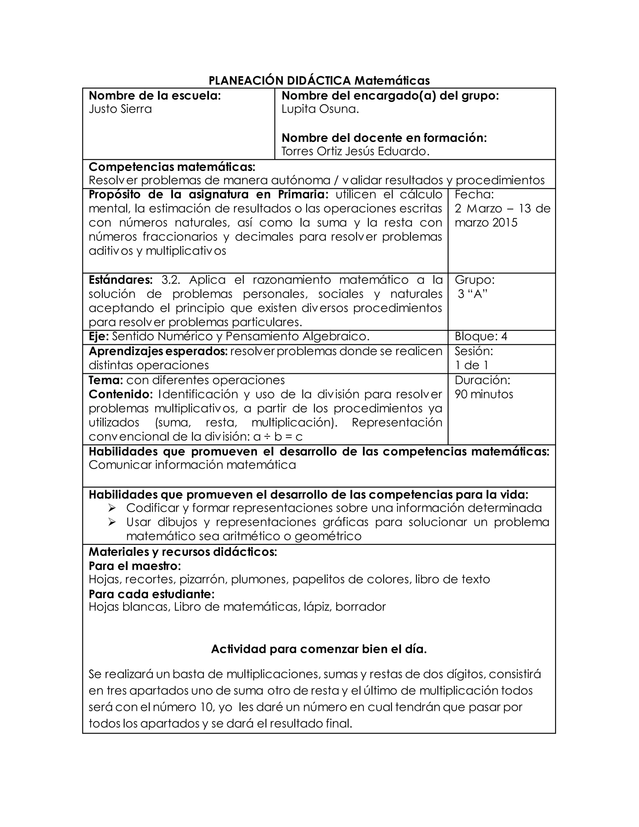 Este documento presenta un plan de lección de matemáticas para estudiantes de primaria. La lección se centra en enseñar a los estudiantes a resolver problemas utilizando la división. La lección incluye actividades interactivas que utilizan ejemplos del mundo real y videojuegos populares para motivar a los estudiantes. La lección concluye con una discusión sobre lo que los estudiantes aprendieron.