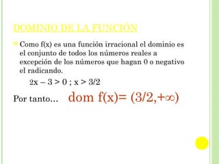 La función f(x)=√(2x-3) tiene un dominio de (3/2, +∞) porque el radicando 2x-3 sólo puede ser mayor o igual a cero para valores de x mayores o iguales que 3/2. La única raíz en y es (3/2,0) ya que es el único punto donde el radicando se hace cero. No existen raíces en x porque la función no es definida para x=0.